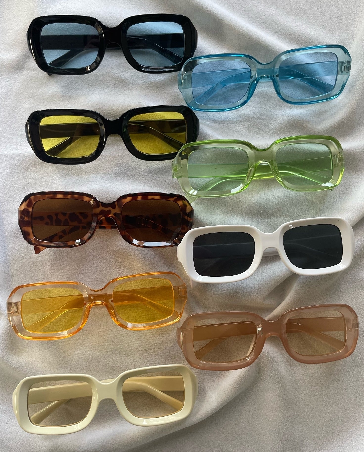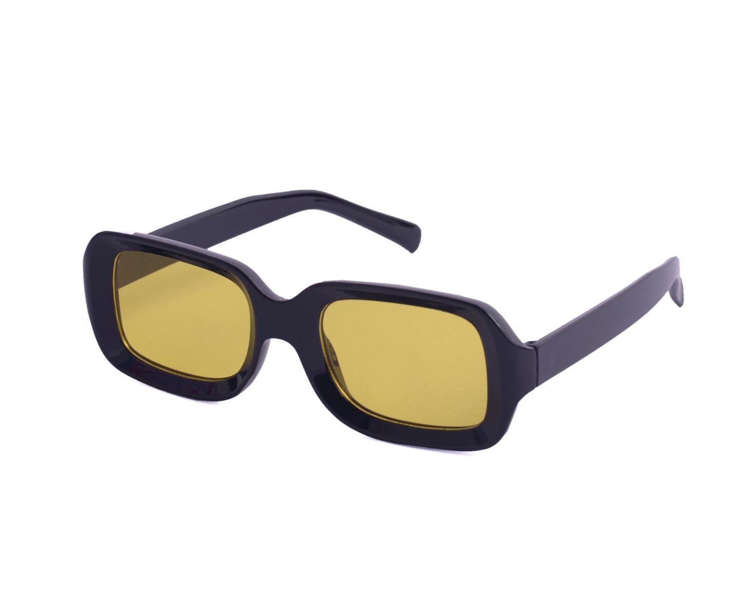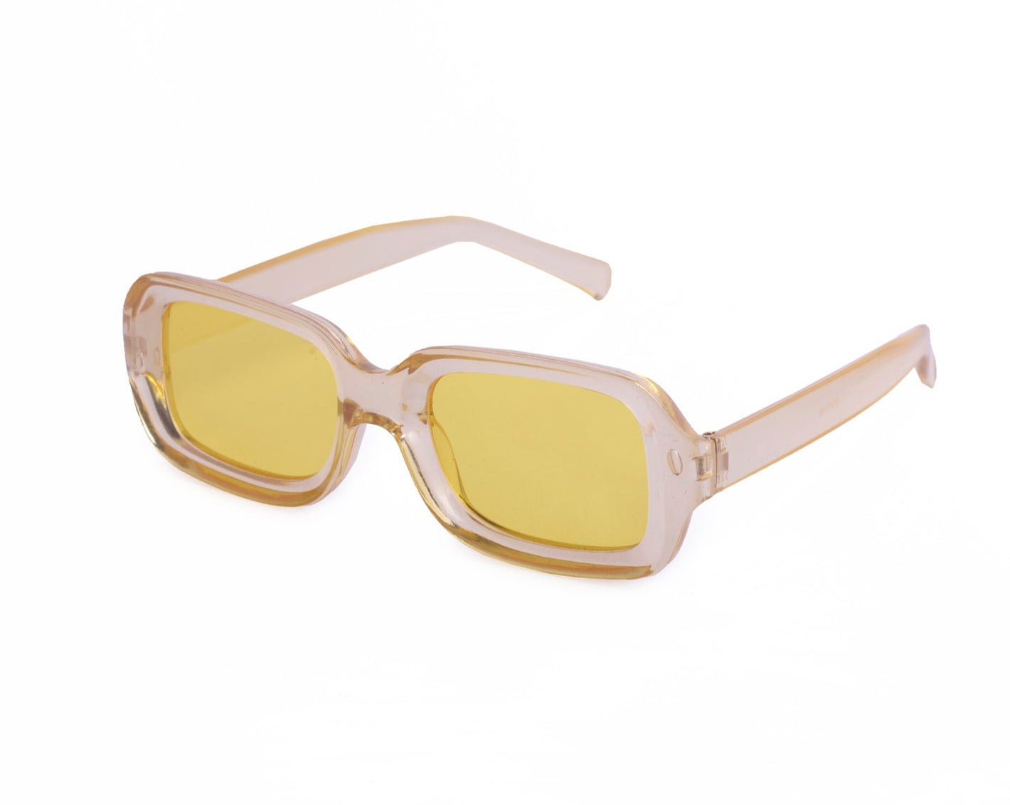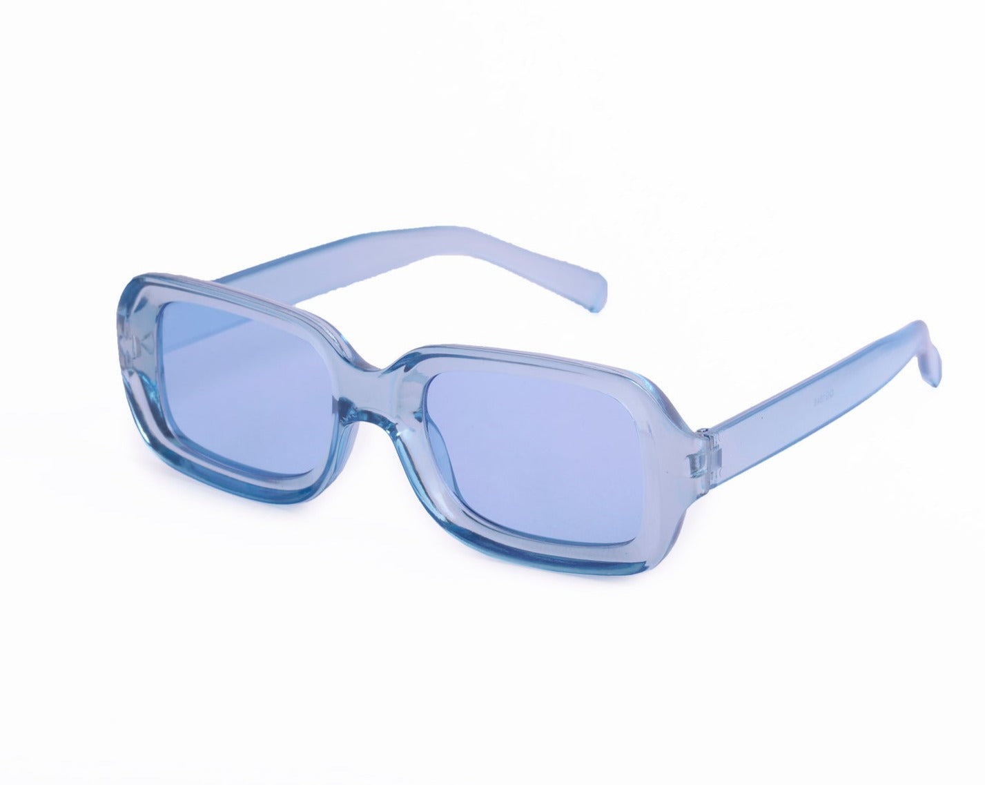 Sunglasses with frames and sidepieces in plastic and tinted, UV-protective lenses.