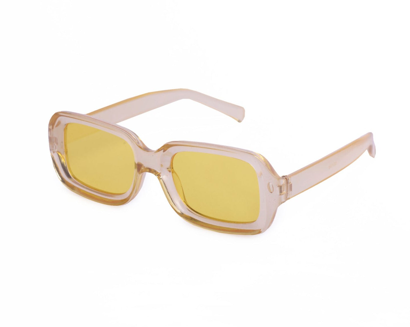 Sunglasses with frames and sidepieces in plastic and tinted, UV-protective lenses.